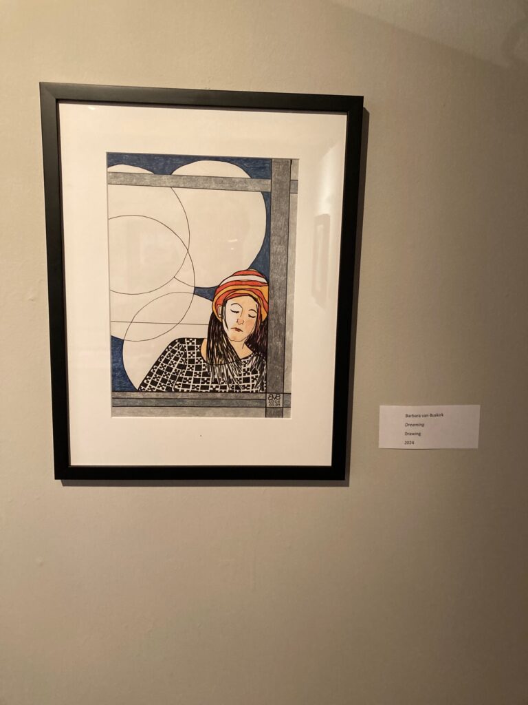 Also on display (above) is Dreaming (2024) from my first whimsical drawing series. This colored pencil and Pigma Micron ink pen drawing continues the hand knit theme of my entries this year as it features a sleeping woman wearing a black and white colorwork sweater.