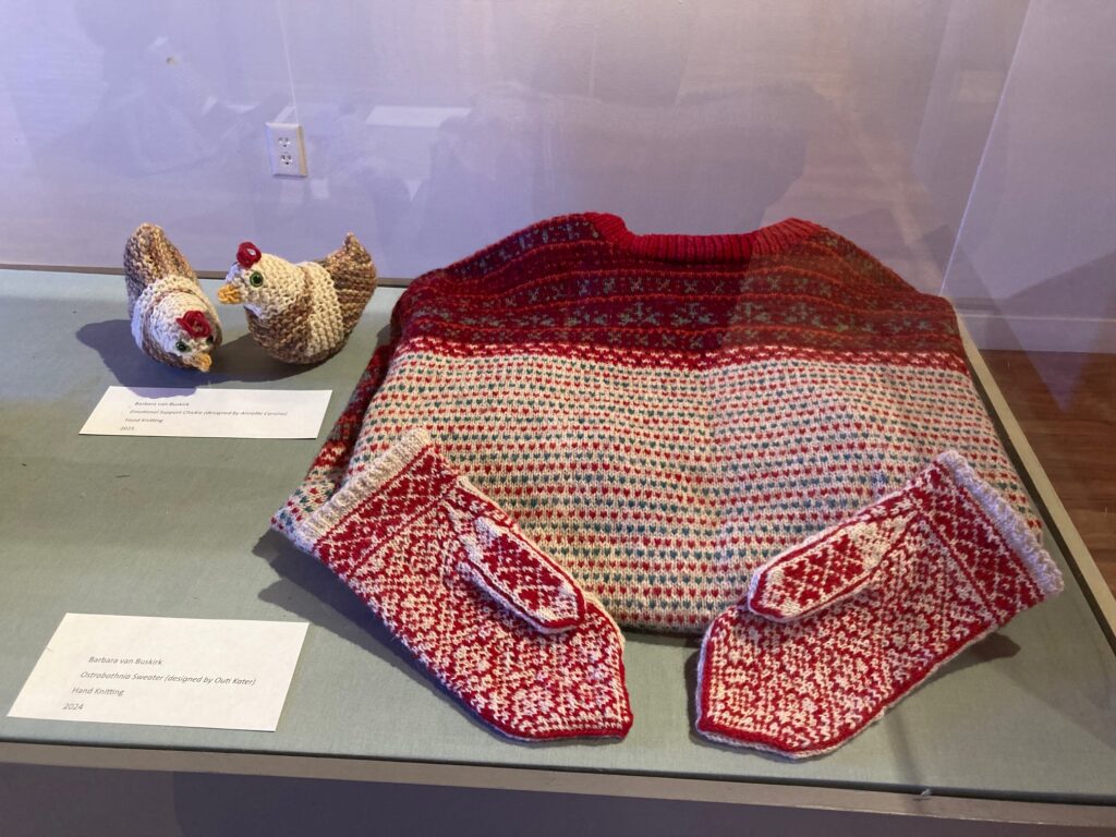 I have four entries in this show, including three hand knit projects and one whimsical drawing. In the photo above, you can see my twin Emotional Support Chickie (2025) designed by Annette Corsino, Ostrobothnia Sweater (2024) designed by Outi Kater, and Ukraina Mittens (2025) designed by Maria Näslund.